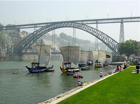 Foto tirada da marginal de Gaia tendo como fundo vários barcos rabelo e a Ponte D.Luiz I