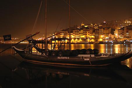 O Barco Rabelo repousa no Douro iluminado pelas luzes da cidade.